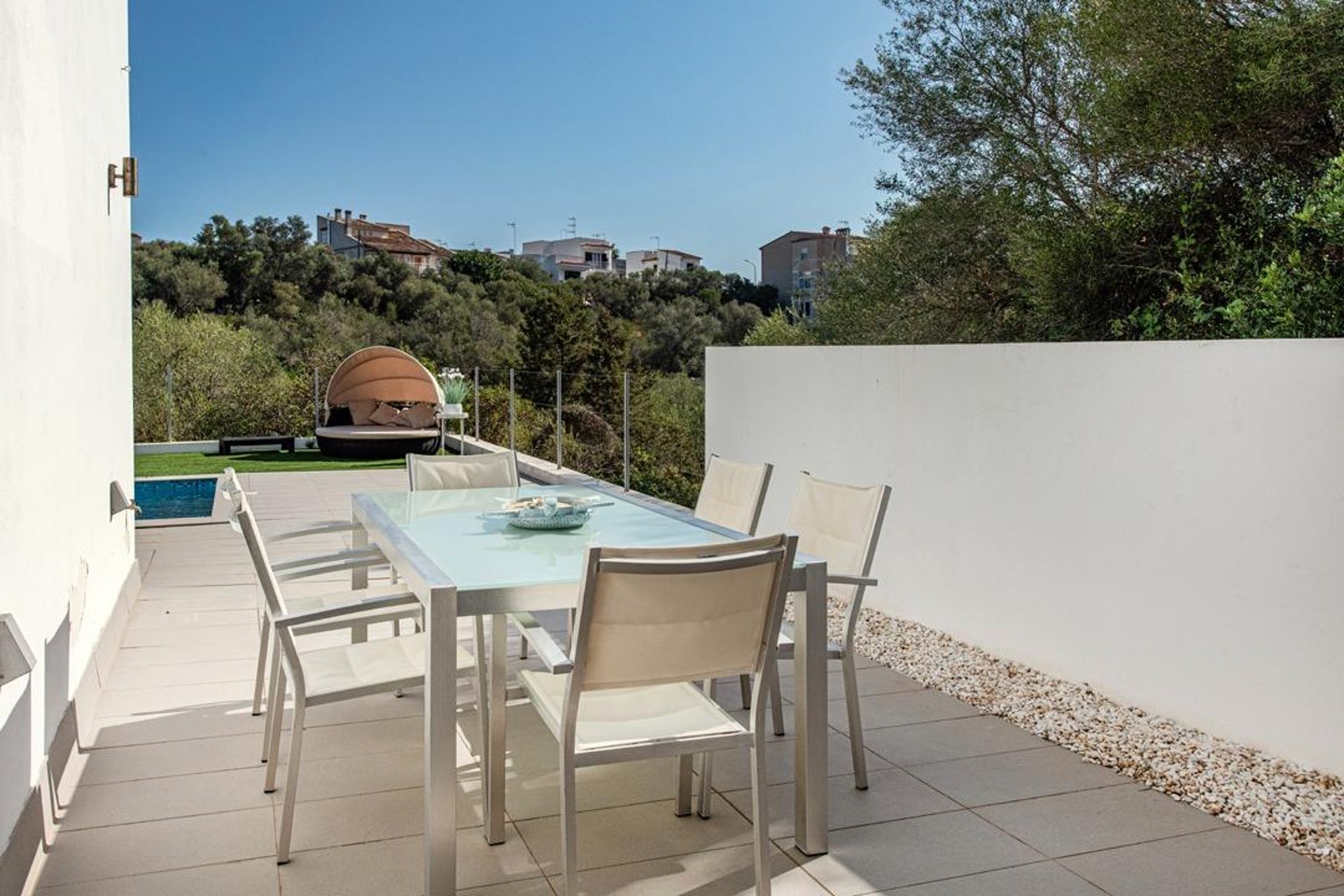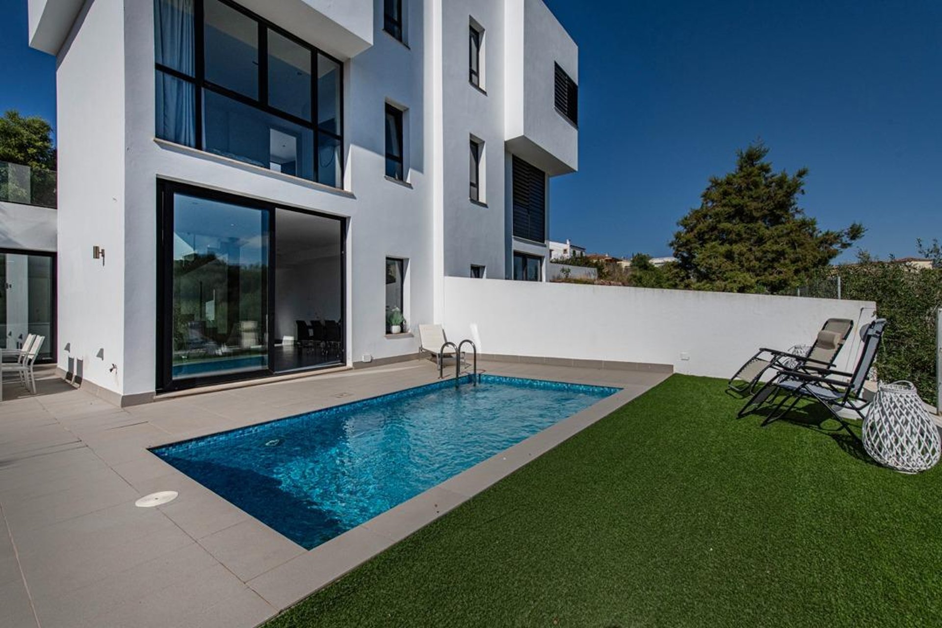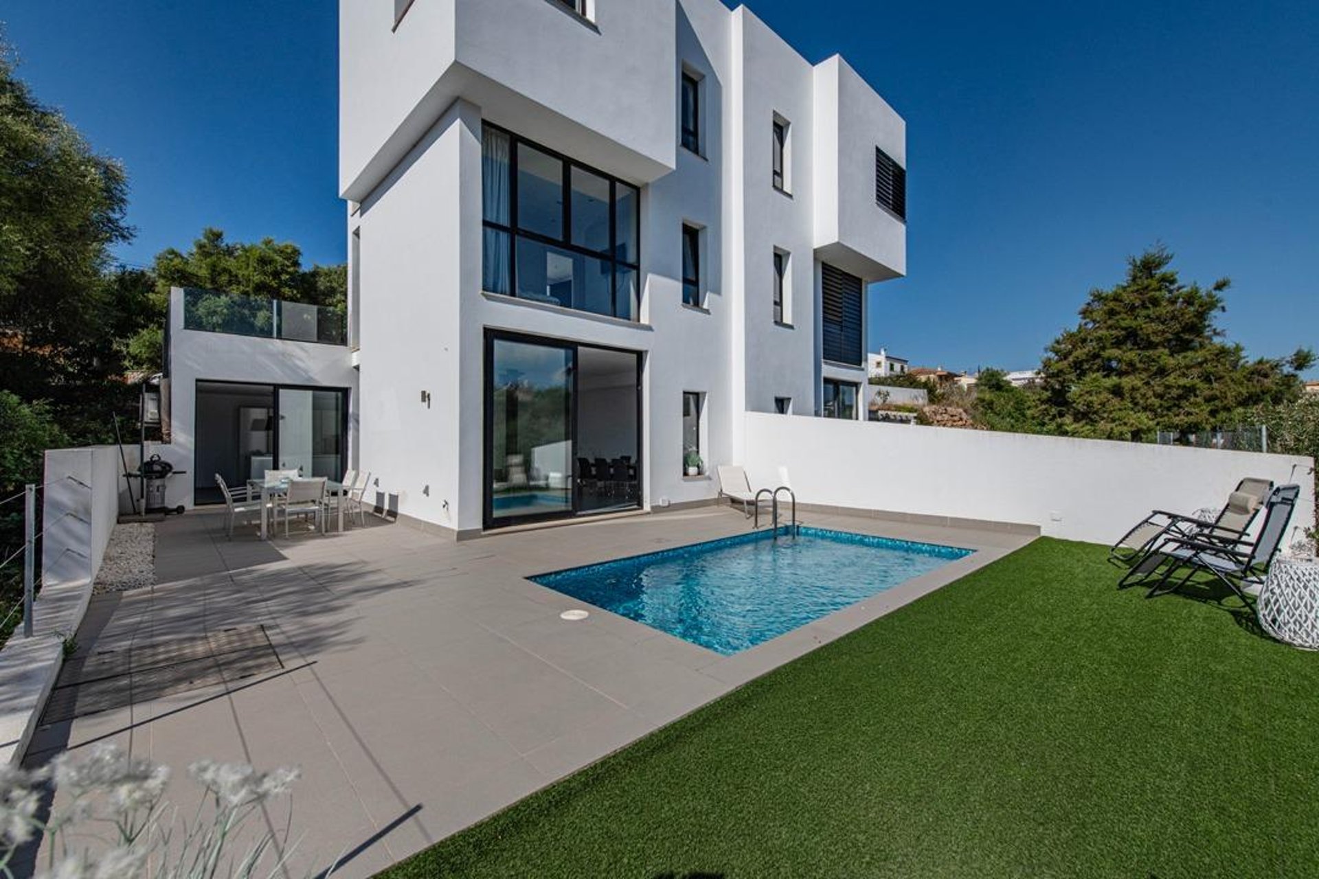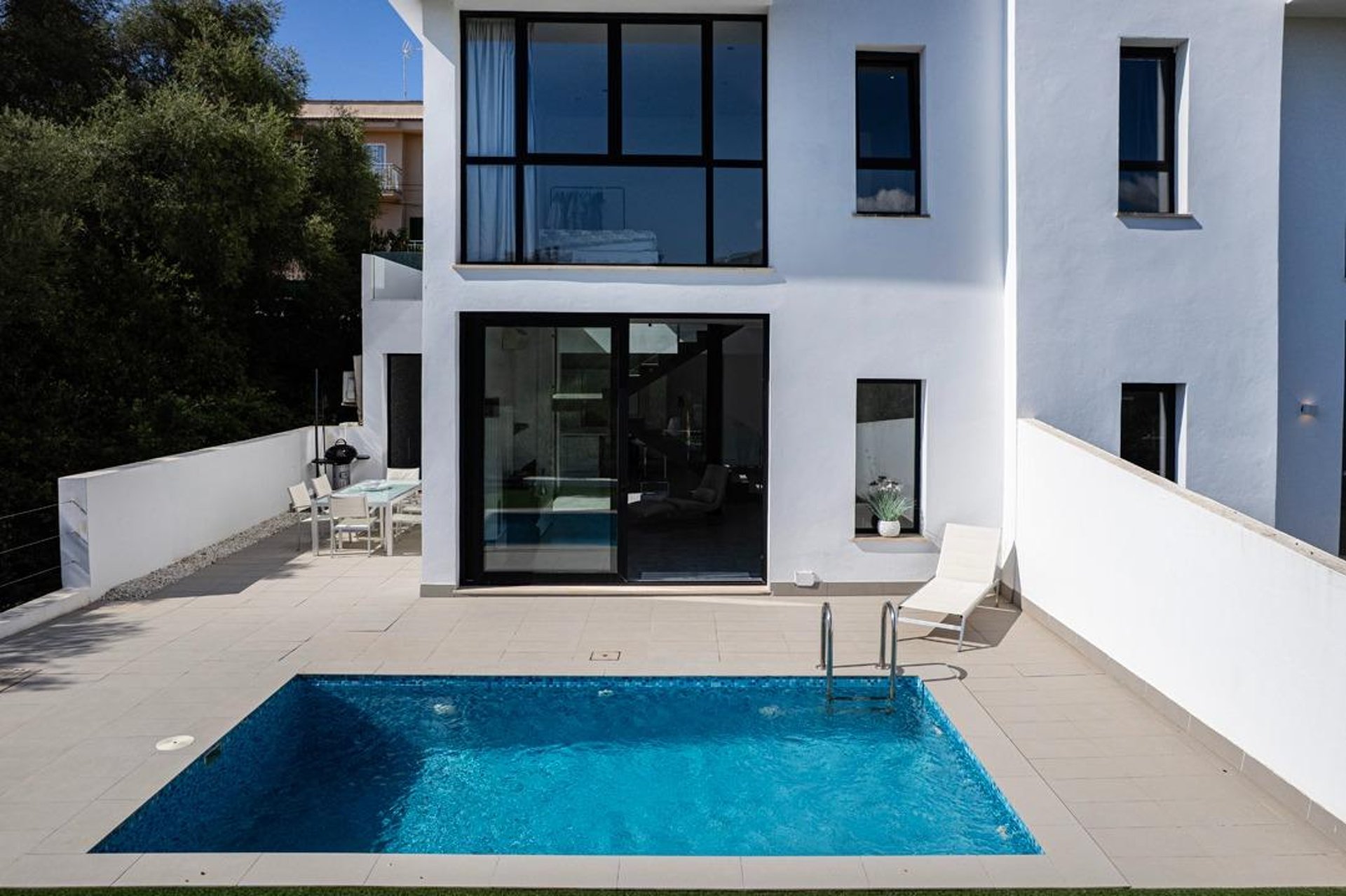 Upon arrival, you are welcomed by a modern, well-maintained façade and contemporary architecture. Built in 2010 on a plot of about 220 m², the exterior is designed to make the most of the Mediterranean climate: a spacious, sunny terrace—perfect for outdoor dining—and a private saltwater pool that invites relaxation and memorable moments with family and friends.