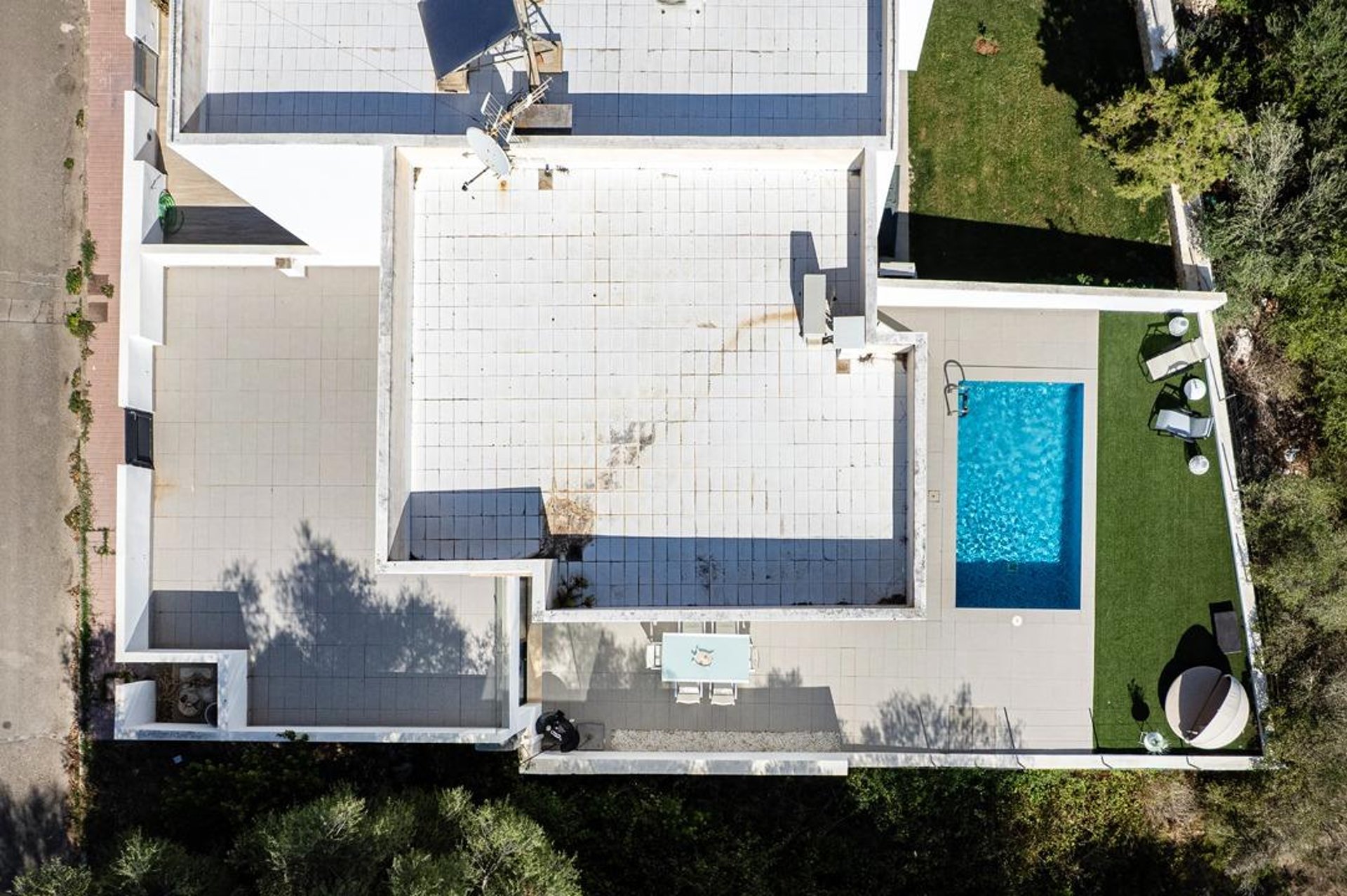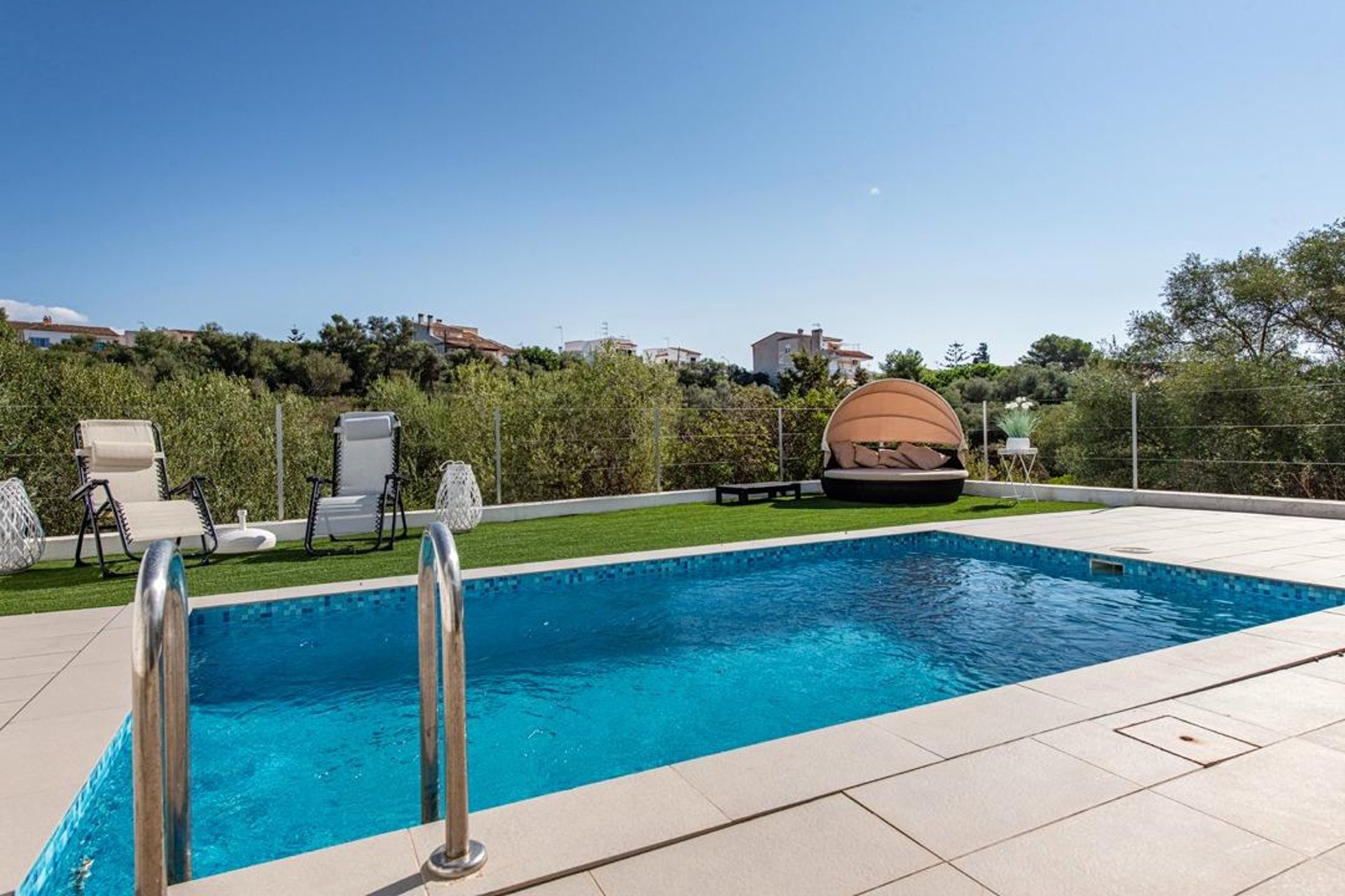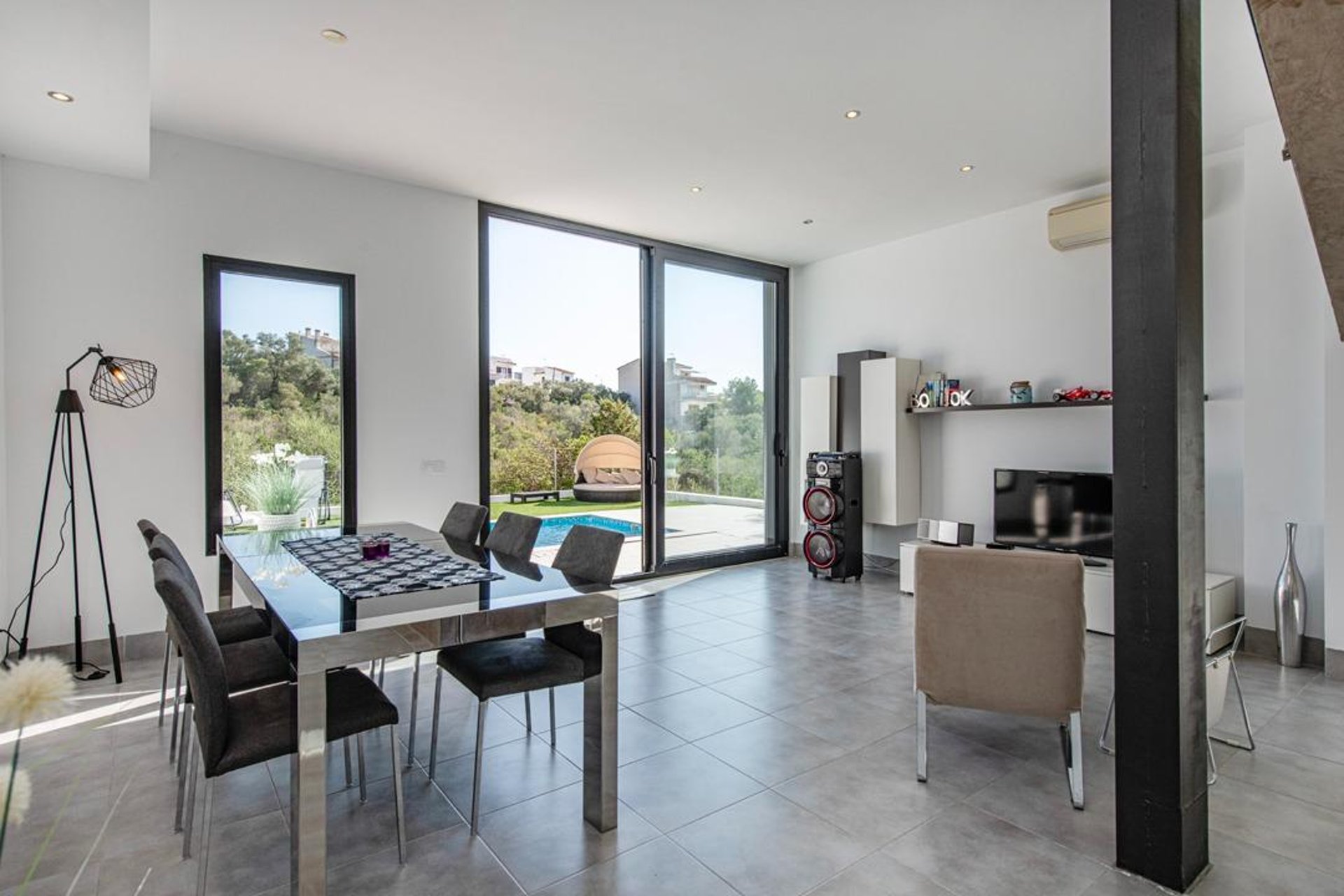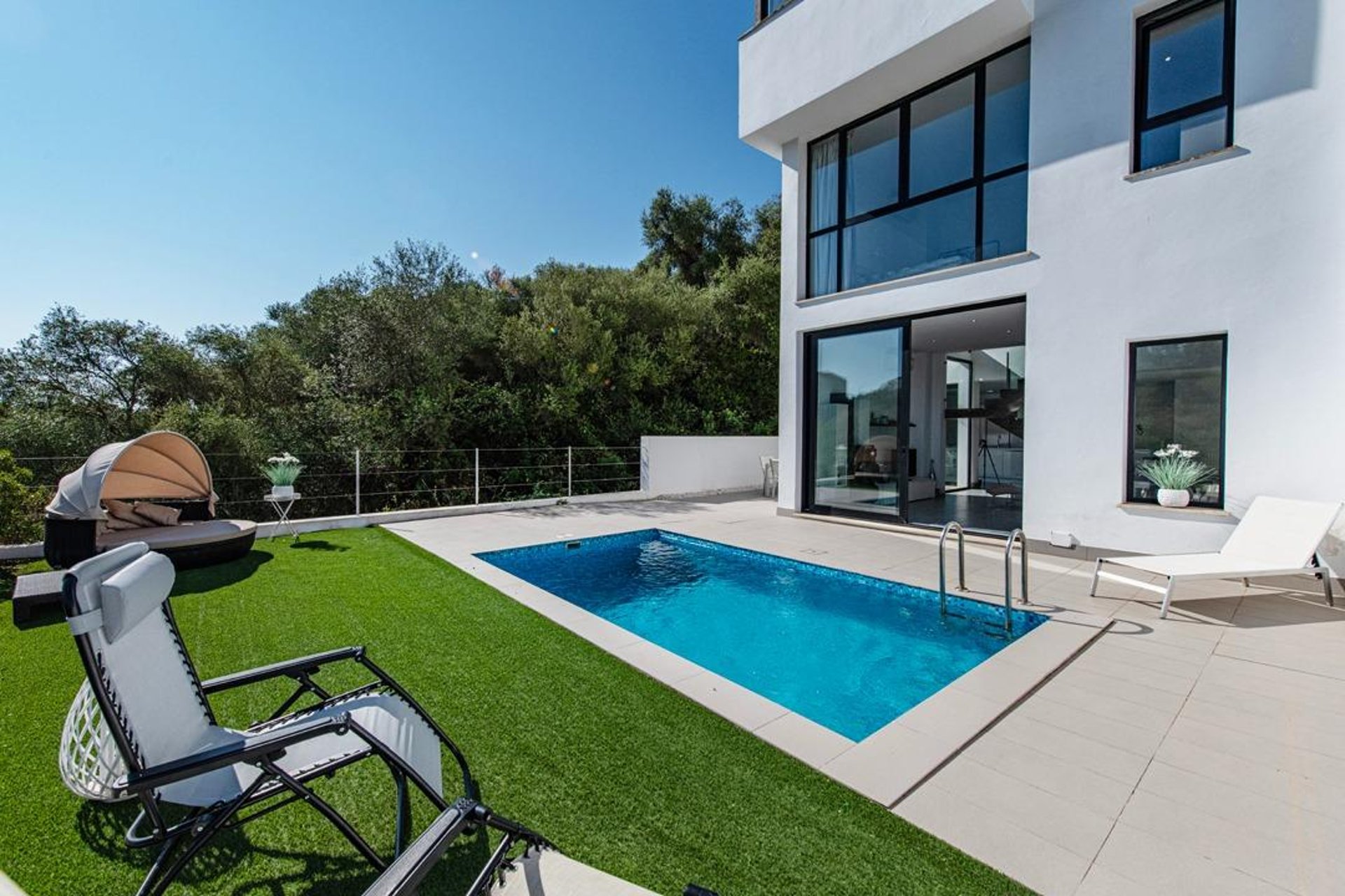 Upon arrival, you are welcomed by a modern, well-maintained façade and contemporary architecture. Built in 2010 on a plot of about 220 m², the exterior is designed to make the most of the Mediterranean climate: a spacious, sunny terrace—perfect for outdoor dining—and a private saltwater pool that invites relaxation and memorable moments with family and friends.