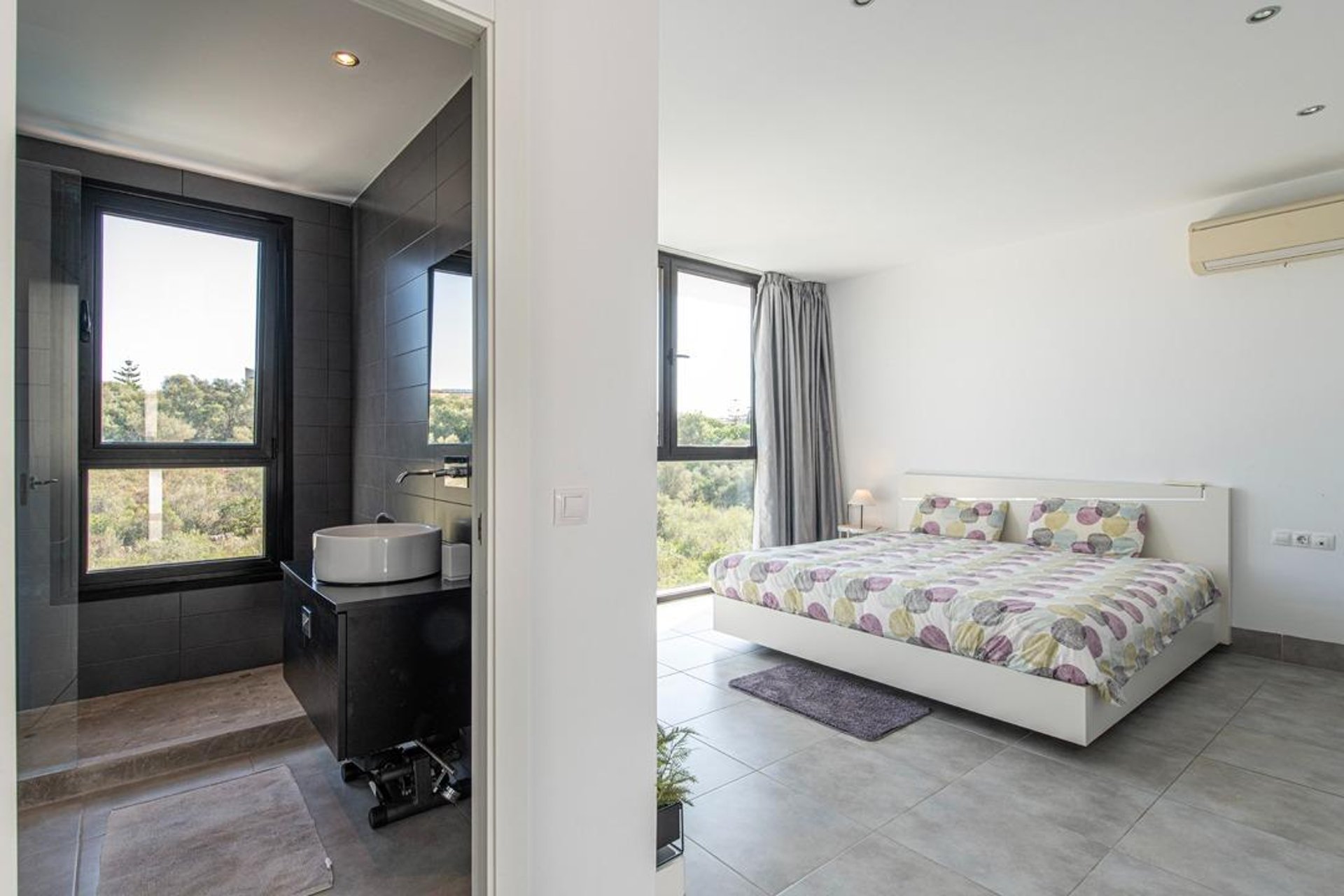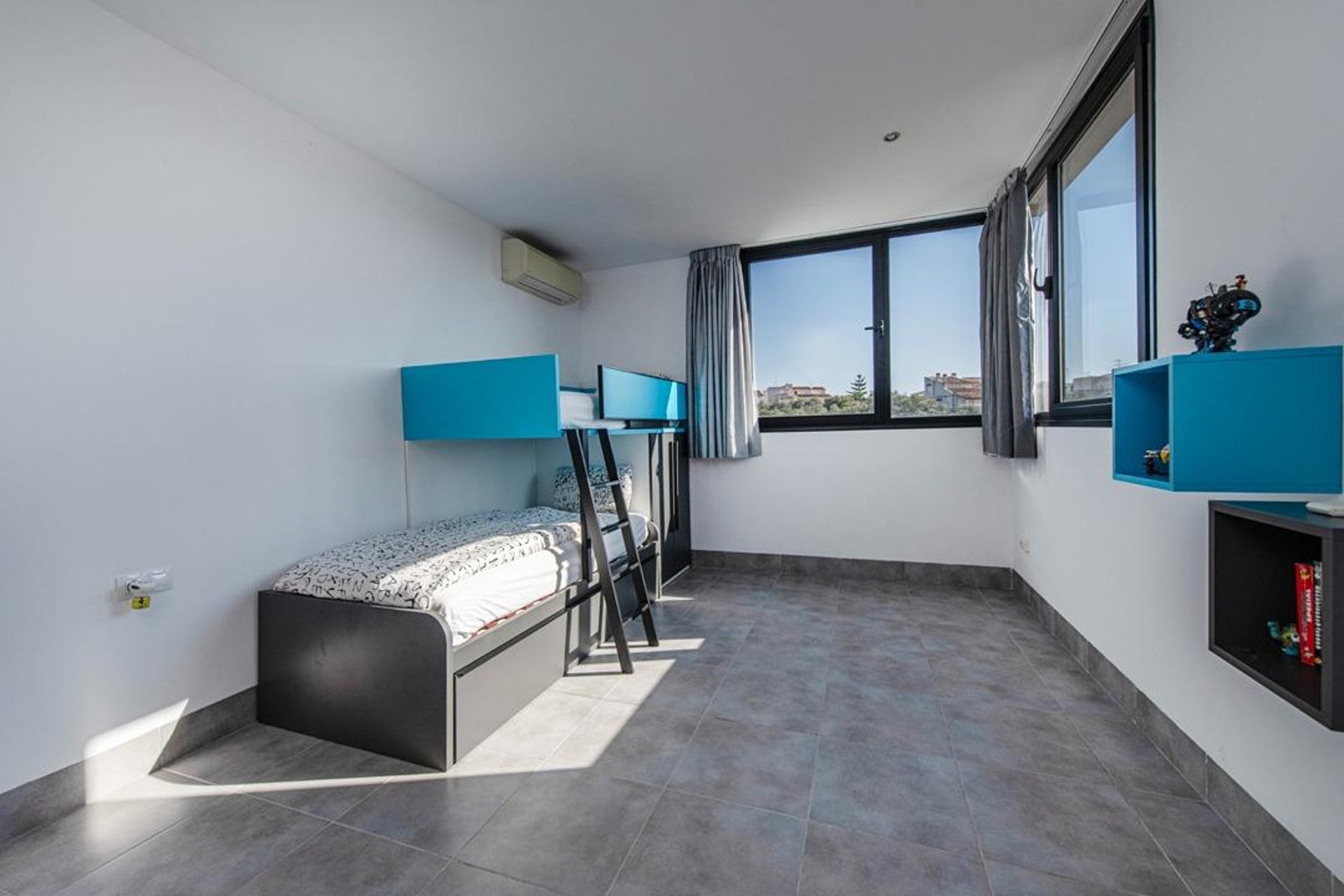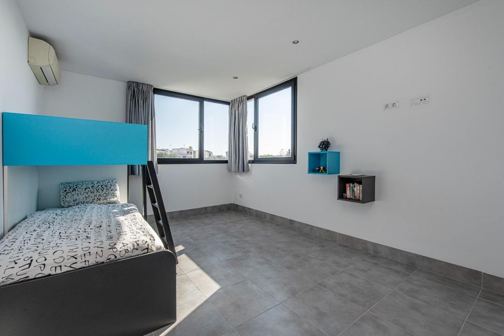 The property features three bedrooms: one double and two singles, all with good natural light and double-glazed PVC windows. The master bedroom, located on the first floor, includes an en-suite bathroom, while the other two bedrooms on the second floor share a second full bathroom. There is also a guest toilet on the ground floor—ideal when entertaining. Each room has hot/cold air conditioning, ensuring comfort throughout the year. Additional features include tiled floors, thick insulated walls, and a water softener system.