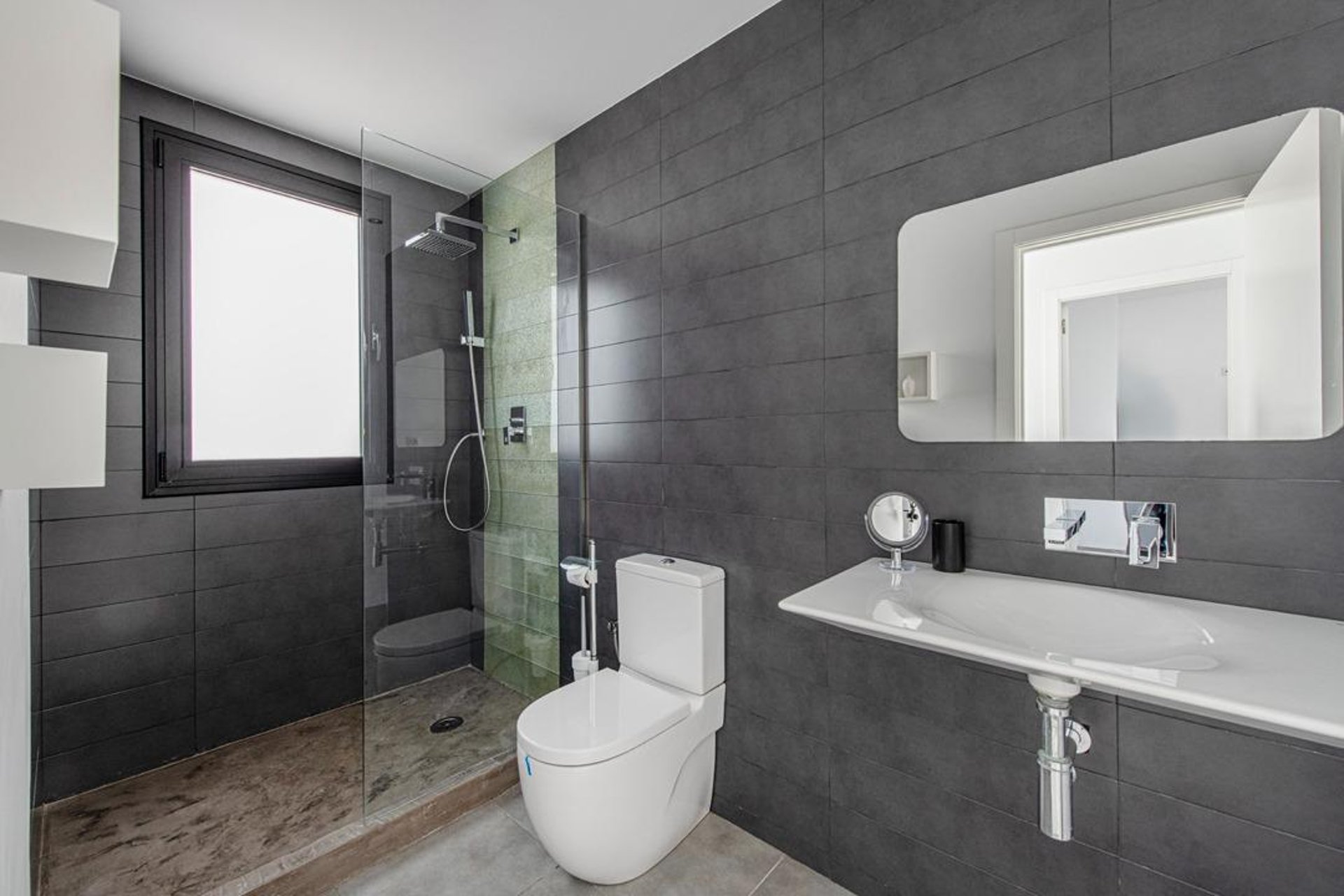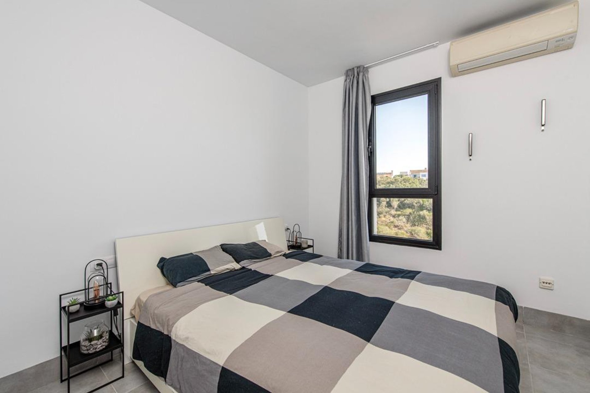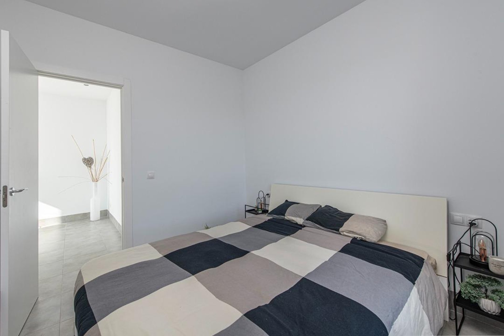 The property features three bedrooms: one double and two singles, all with good natural light and double-glazed PVC windows. The master bedroom, located on the first floor, includes an en-suite bathroom, while the other two bedrooms on the second floor share a second full bathroom. There is also a guest toilet on the ground floor—ideal when entertaining. Each room has hot/cold air conditioning, ensuring comfort throughout the year. Additional features include tiled floors, thick insulated walls, and a water softener system.
