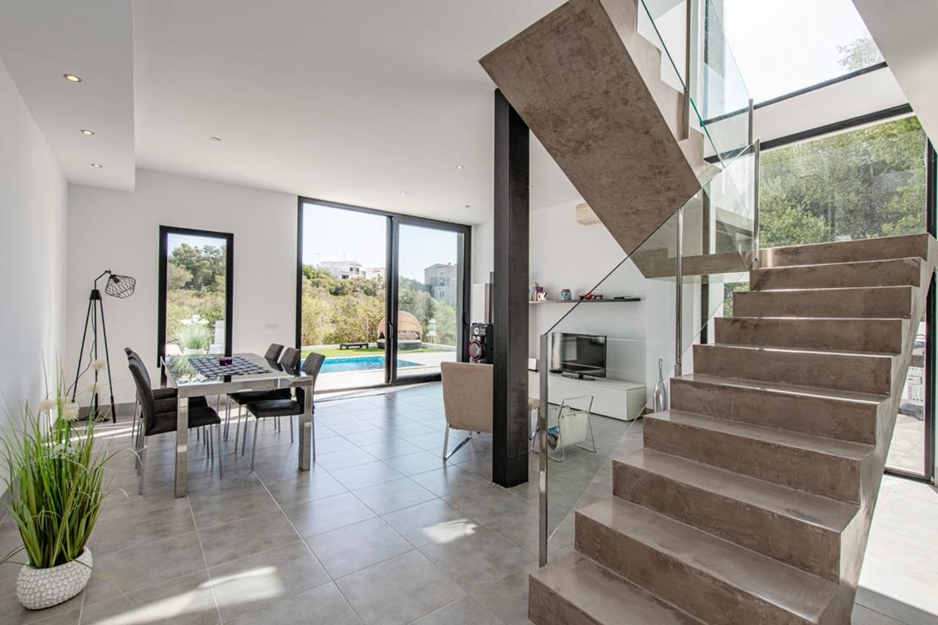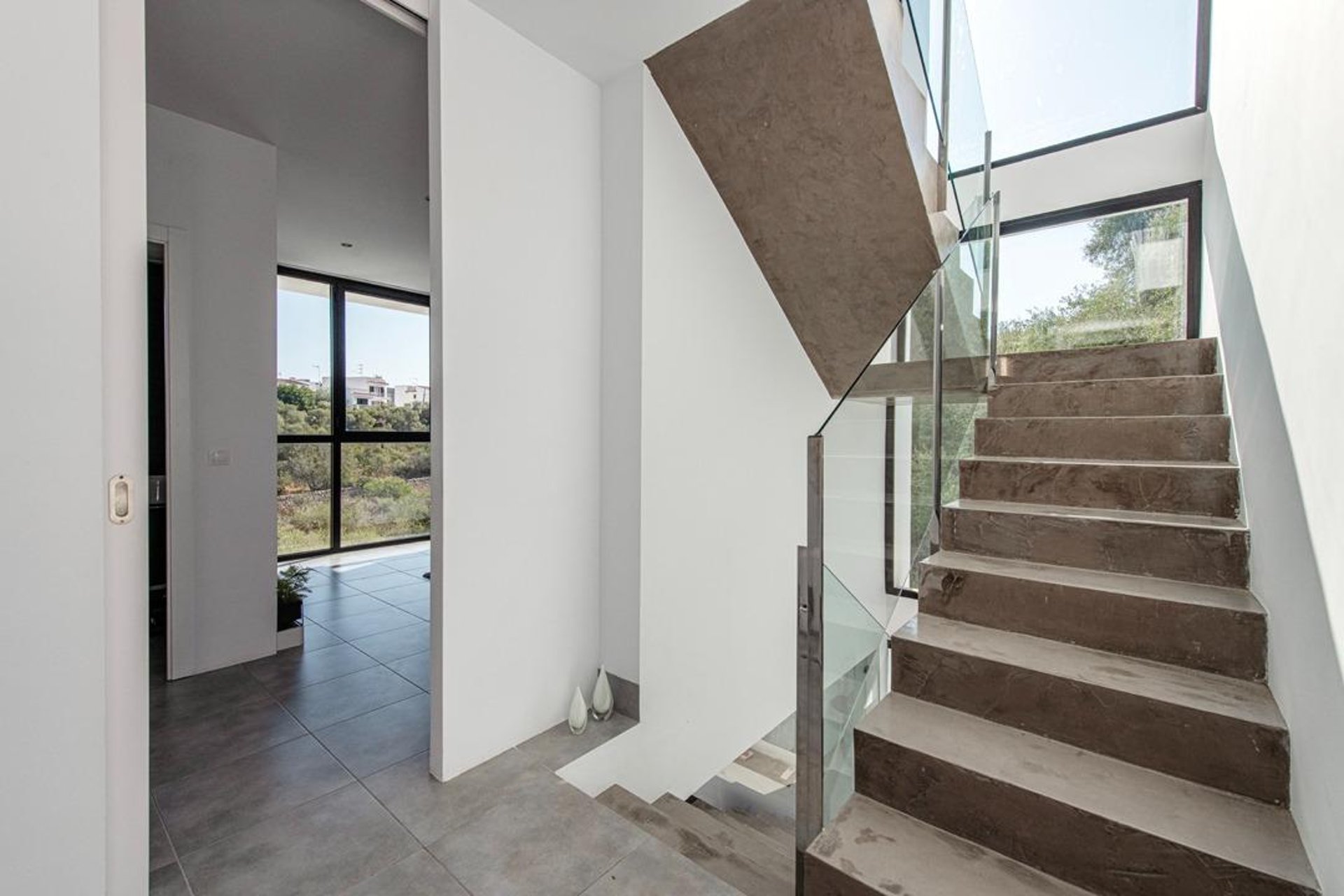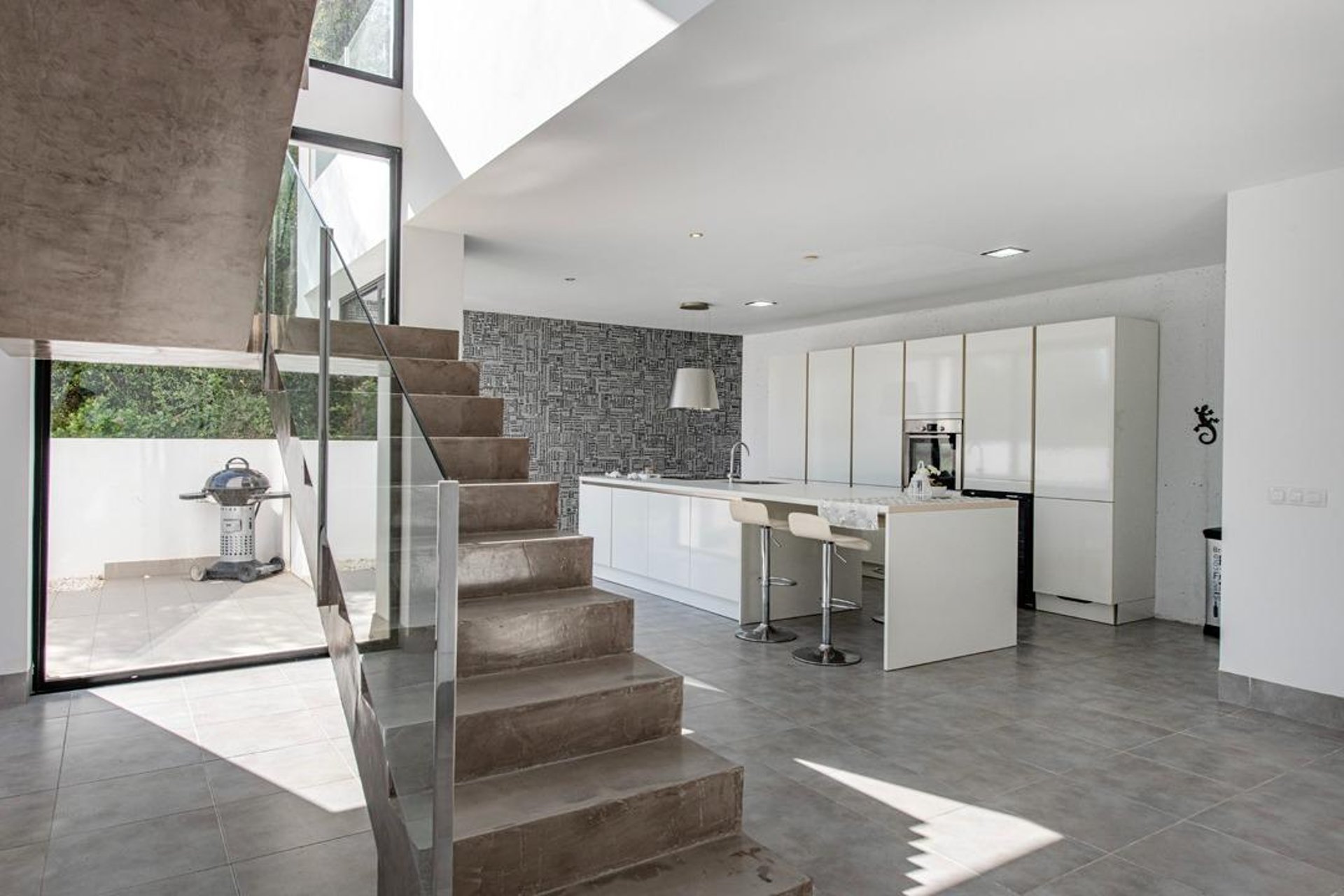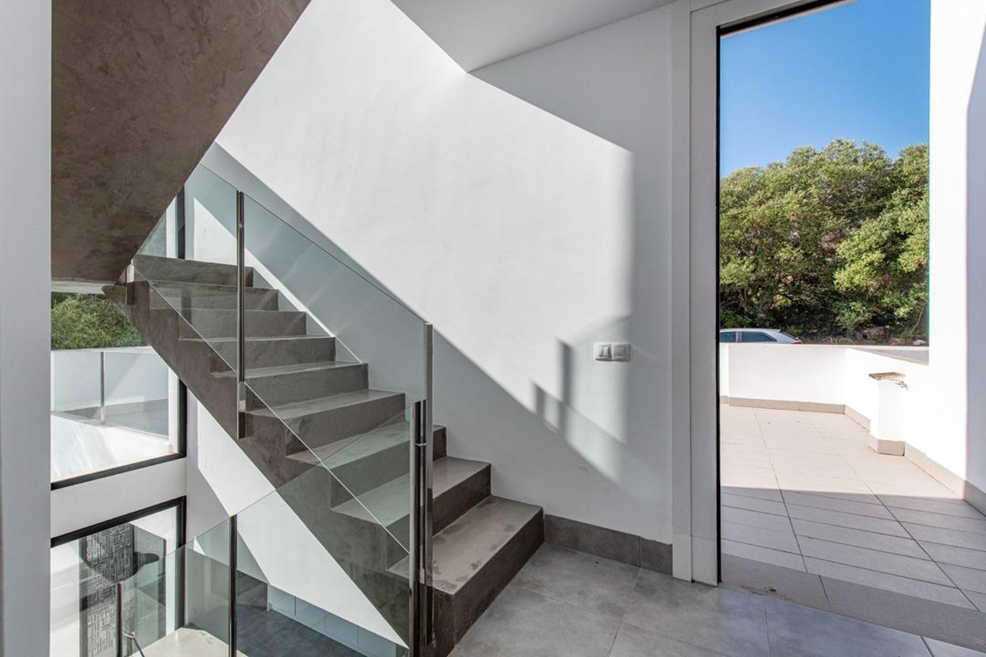 The house offers 138 m² spread over three levels, with a bright and functional layout. Upon entering, the spectacular open concrete-and-glass staircase stands out—an architectural detail that adds character and elegance throughout the home.