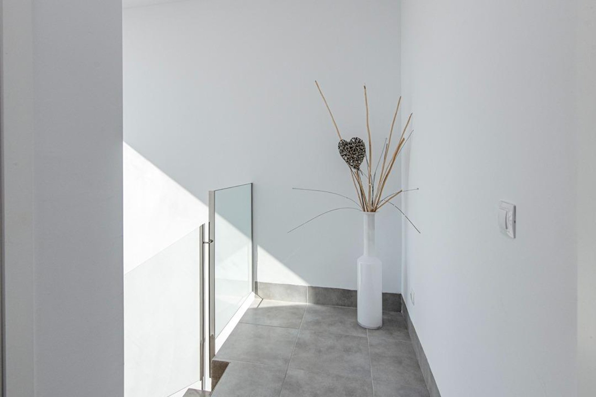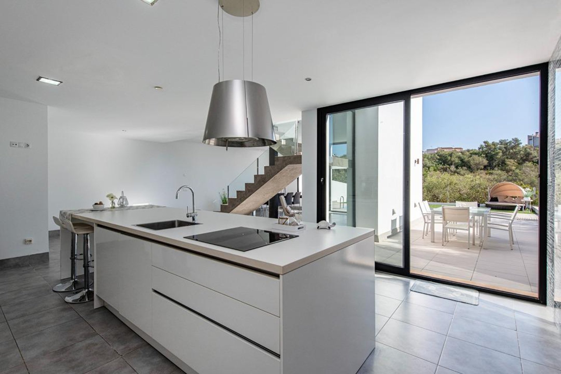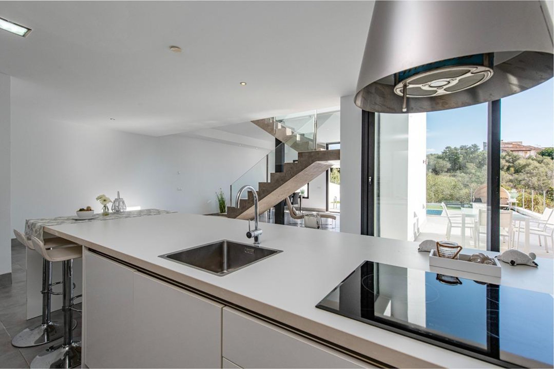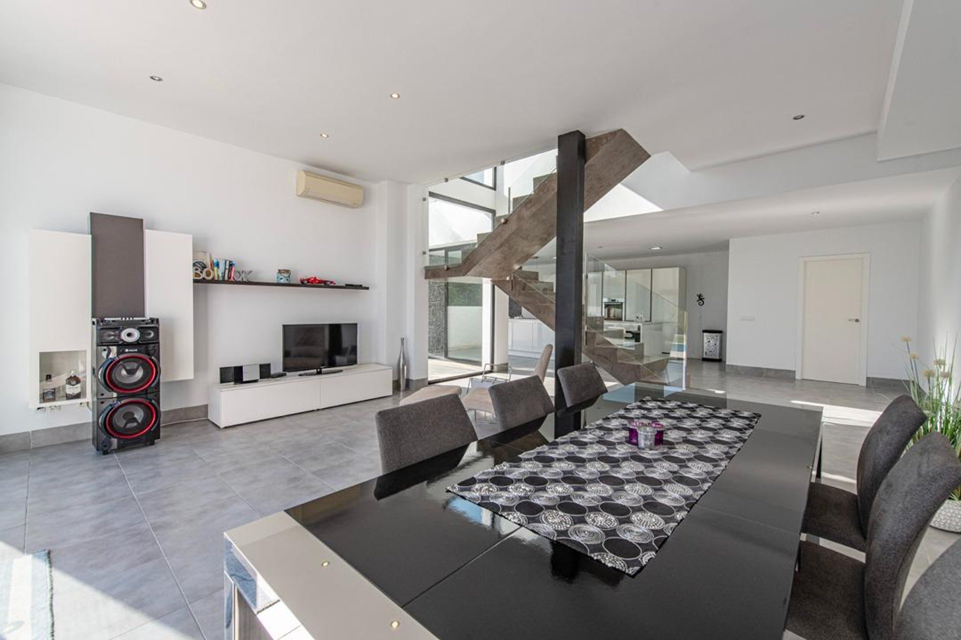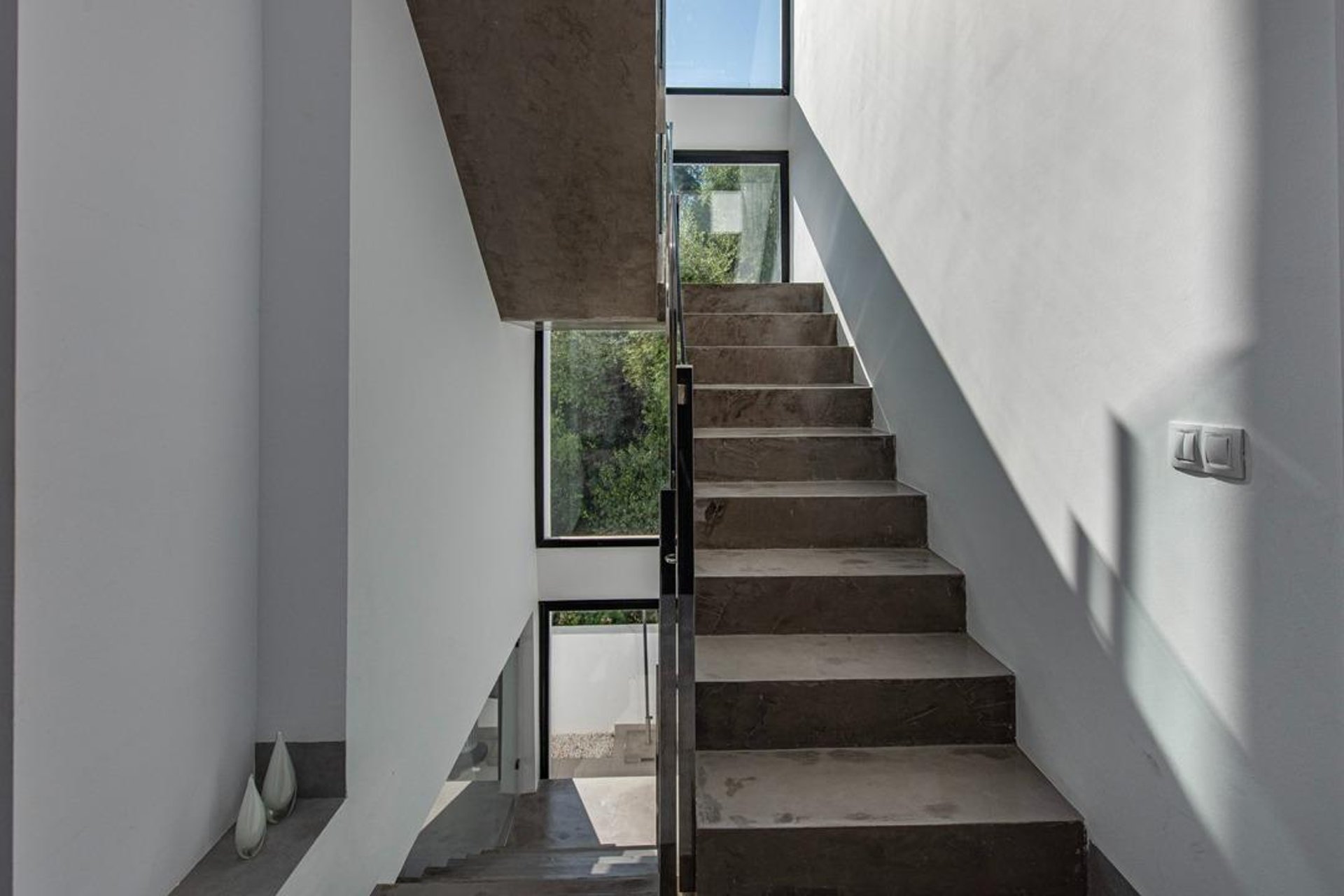 The house offers 138 m² spread over three levels, with a bright and functional layout. Upon entering, the spectacular open concrete-and-glass staircase stands out—an architectural detail that adds character and elegance throughout the home.
