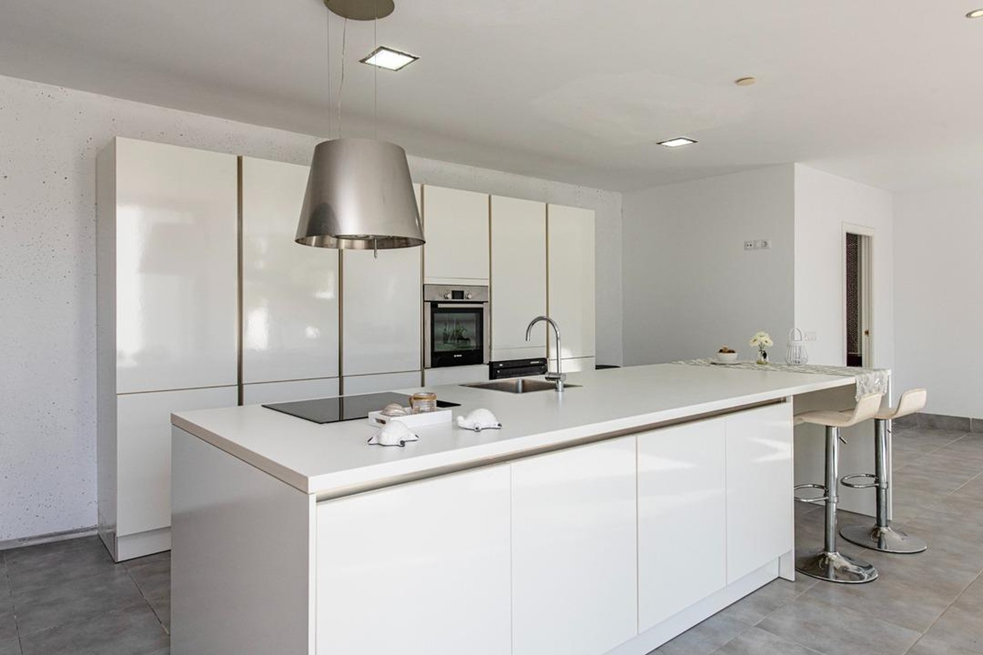 On the ground floor, you’ll find a spacious open-plan kitchen with a central island, fully equipped with extractor hood, cooker, oven, microwave, and dishwasher, seamlessly connected to the living-dining area. Large double-glazed PVC sliding doors flood the space with natural light and open directly to the terrace and pool, creating a perfect transition between indoors and outdoors—designed to be enjoyed all year round.